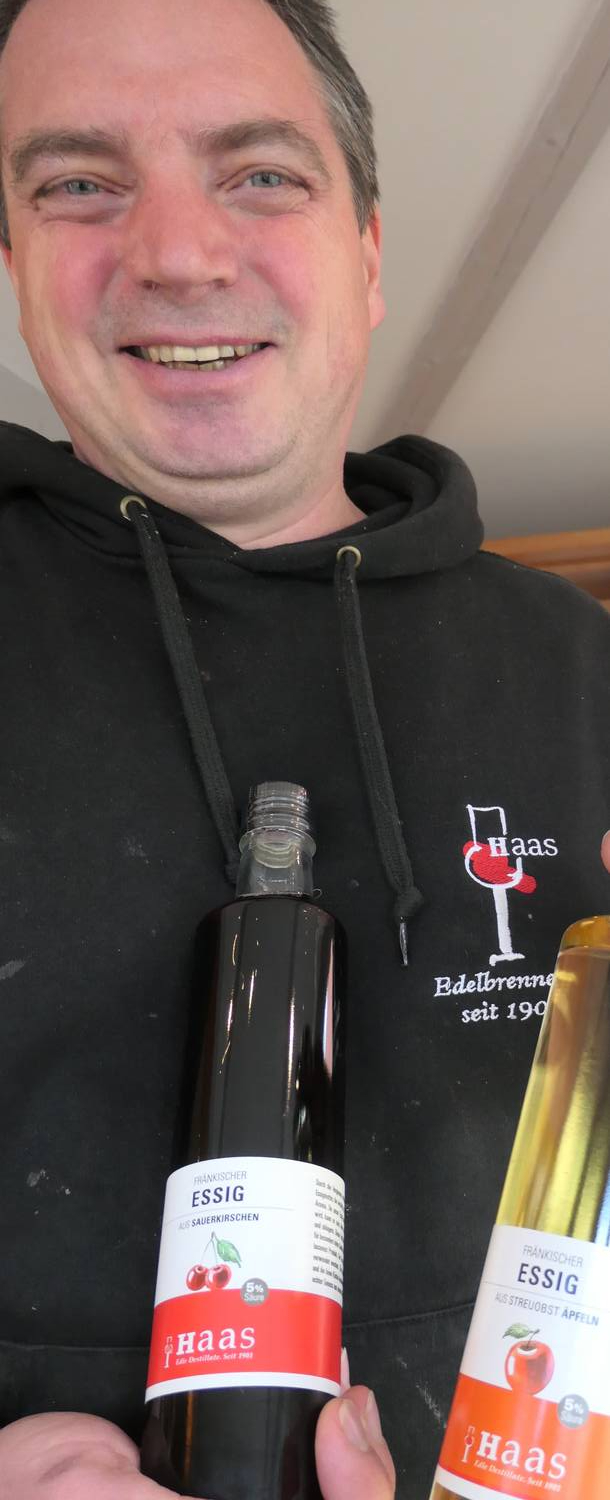 Die Spezialitäten-Auswahl ist riesengroß: Allein 14 (!) verschiedene-Apfelbrände (vorwiegend aus alten Sorten) sind im Haas-Angebot (unser Foto unten links). Die Apfelbrand-Destillate tragen geheimnisvolle (und historische) Namen: Berner Rosen Apfel beispielsweise, oder: Champagner Renette, oder: Ontario, oder: Royal Gala. Und eine weitere (neue) kulinarische Attraktion präsentiert Johannes Haas: Essig-Spezialitäten - alles für die Feinschmecker (Apfel-, Birnen-, Spargel-, Bärlauch-, Himbeer-, Pfirsich-, Quitte-, Riesling-, Sauerkirsch-, Tomaten- und Williams Birnen-Essig - alles Spitzenklasse!). Besuchen Sie einfach ´mal bei einem kleinen Ausflug die Destillerie Johannes Haas in Pretzfeld (bei Ebermannstadt), Schmiedsgasse 2, Tel. 09194/ 1256, www.destillerie-haas.de, geöffnet Montag, Dienstag, Donnerstag und Freitag von 9 bis 12.30 und von 14 bis 18 Uhr, samstags von 9 bis 14 Uhr.