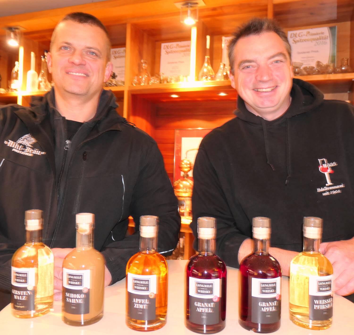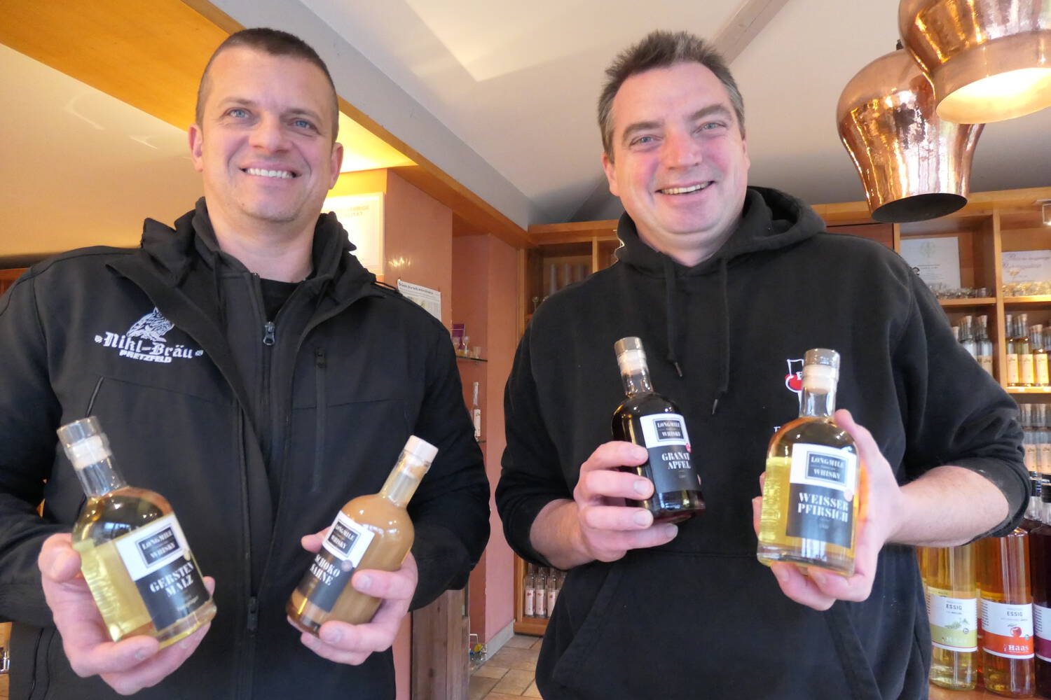 L1002370L1002354Jetzt haben sich zwei Genuss-Experten gefunden: Mike Schmitt,  Braumeister und Chef der Nikl-Brauerei (auf unseren Fotos links) und Johannes Haas (Destillateur und Chef der exklusiven Brennerei Haas, auf den Fotos rechts) - beide aus Pretzfeld - haben sich zusätzlich auf die Herstellung von feinsten Likören spezialisiert (Apfel-Zimt, Granatapfel, Karamell, weißer Pfirsich, Schoko-Sahne).