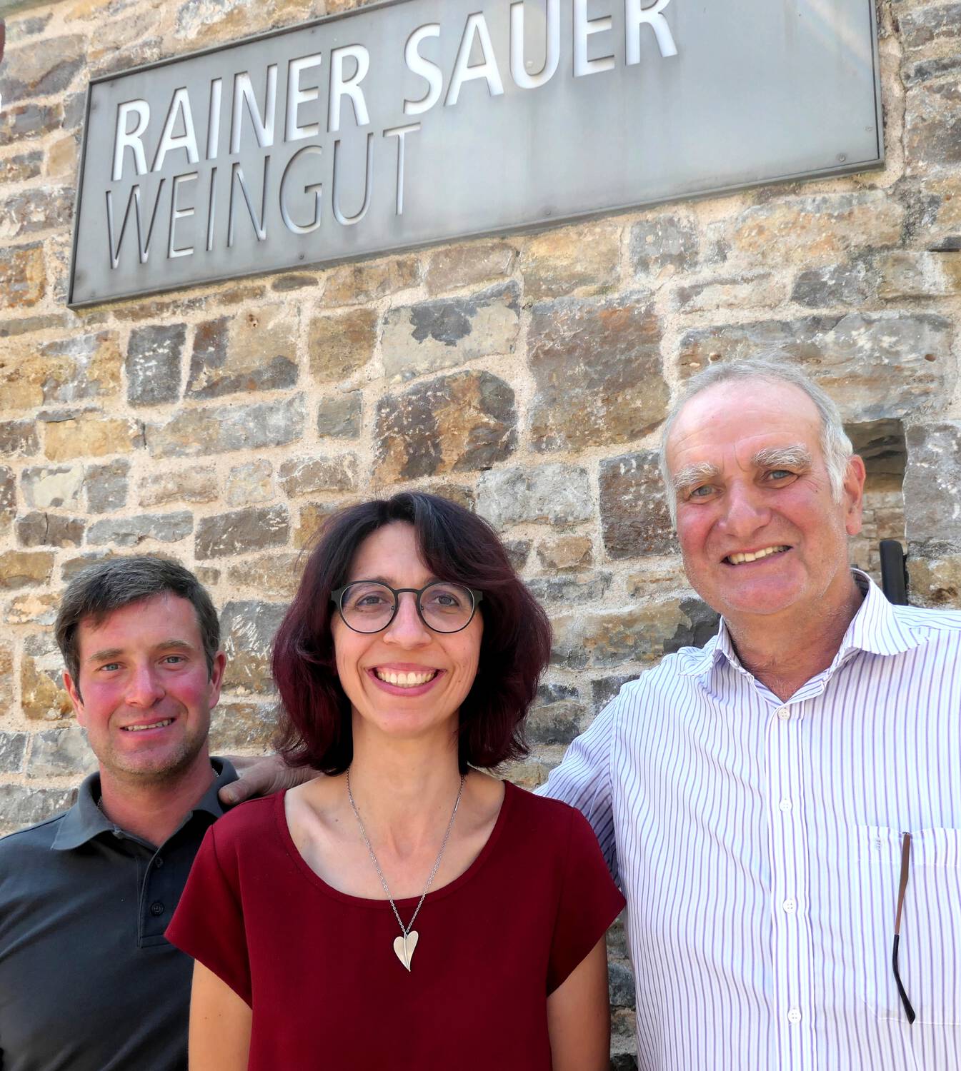 Das Weingut Rainer Sauer - der Senior (r.) hat es an Sohn Daniel (li.) und Schwiegertochter Annemarie (M) übergeben ("2 Generationen, ein  Ziel!") - wurde in diesem Jahr für seinen "2019er Am Lumpen 1655 Riesling VDP, Grosses Gewächs" ausgezeichnet.