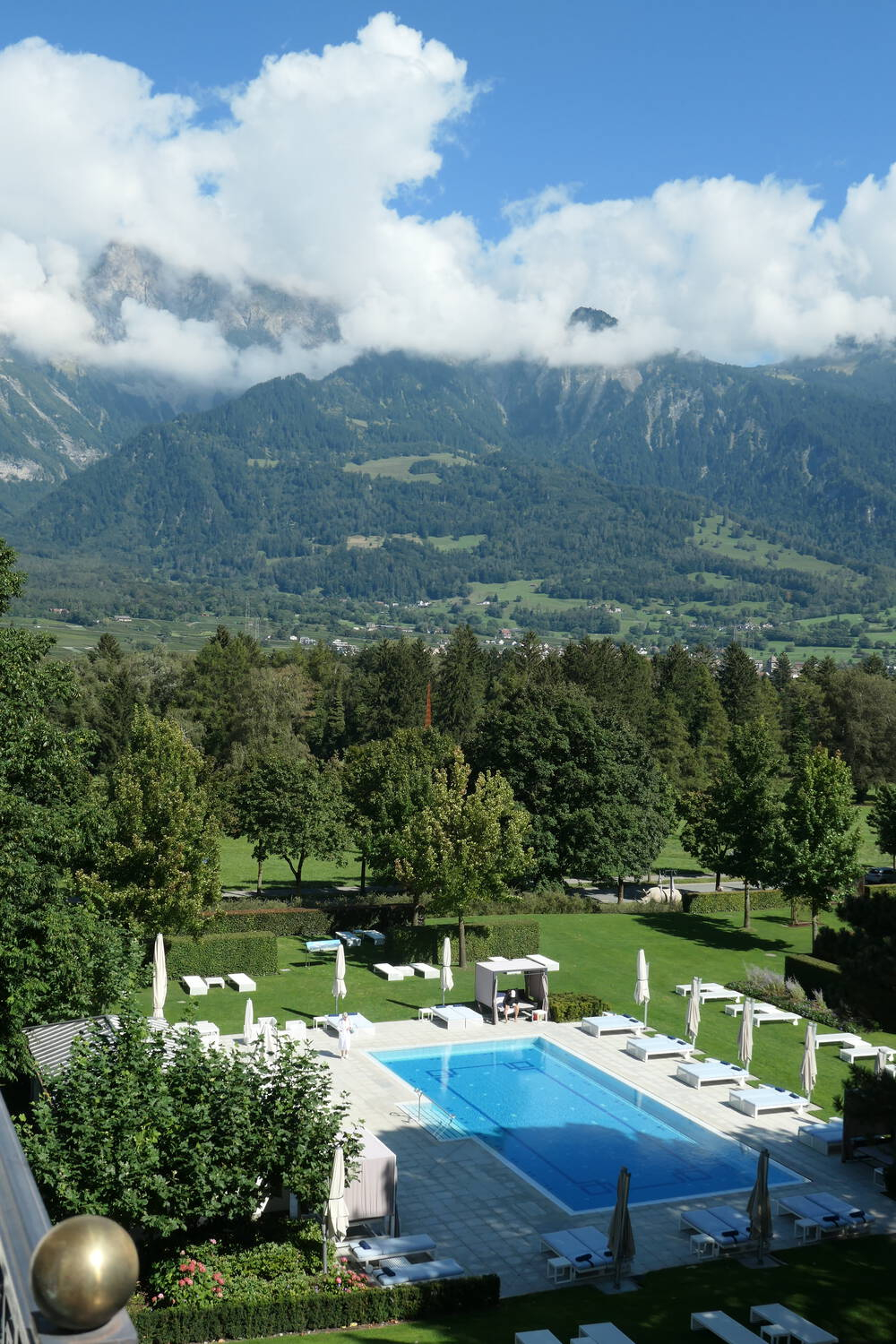 Ein Blick vom Fünf-Sterne-Grand Hotel Quellenhof & Spa Suites des Grand Resort Bad Ragaz auf eine Graubündner Gebirgskette. Die Hotelzimmer sind großzügige angelegt - mit großen und luxurösen Bädern und - ganz wichtig - mit breiten Betten, fluschigen Kissen und allerbesten Matratzen.