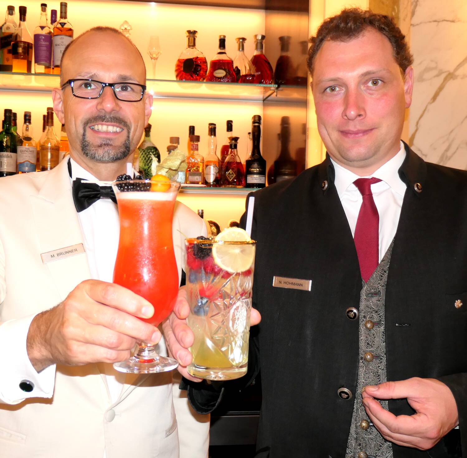 Unten: Barkeeper Brunner (seit 11 Jahren im "Imperial", früher im "Weissen Rössl" am Wolfgangsee, Lieblingsgetränk: Espresso-Martini, Singapur Sling oder "Cola rot" - mit gutem Rotwein "und ein bisserl Cola") mit Bankett- und Bar-Manager Nico Hohmann (im Foto rechts - seit 21 Jahren im "Imperial", liebt zwischendurch auch ein Bierchen - das Otakringer "Wiener Original" oder einen "Wiener Gemischten Satz").