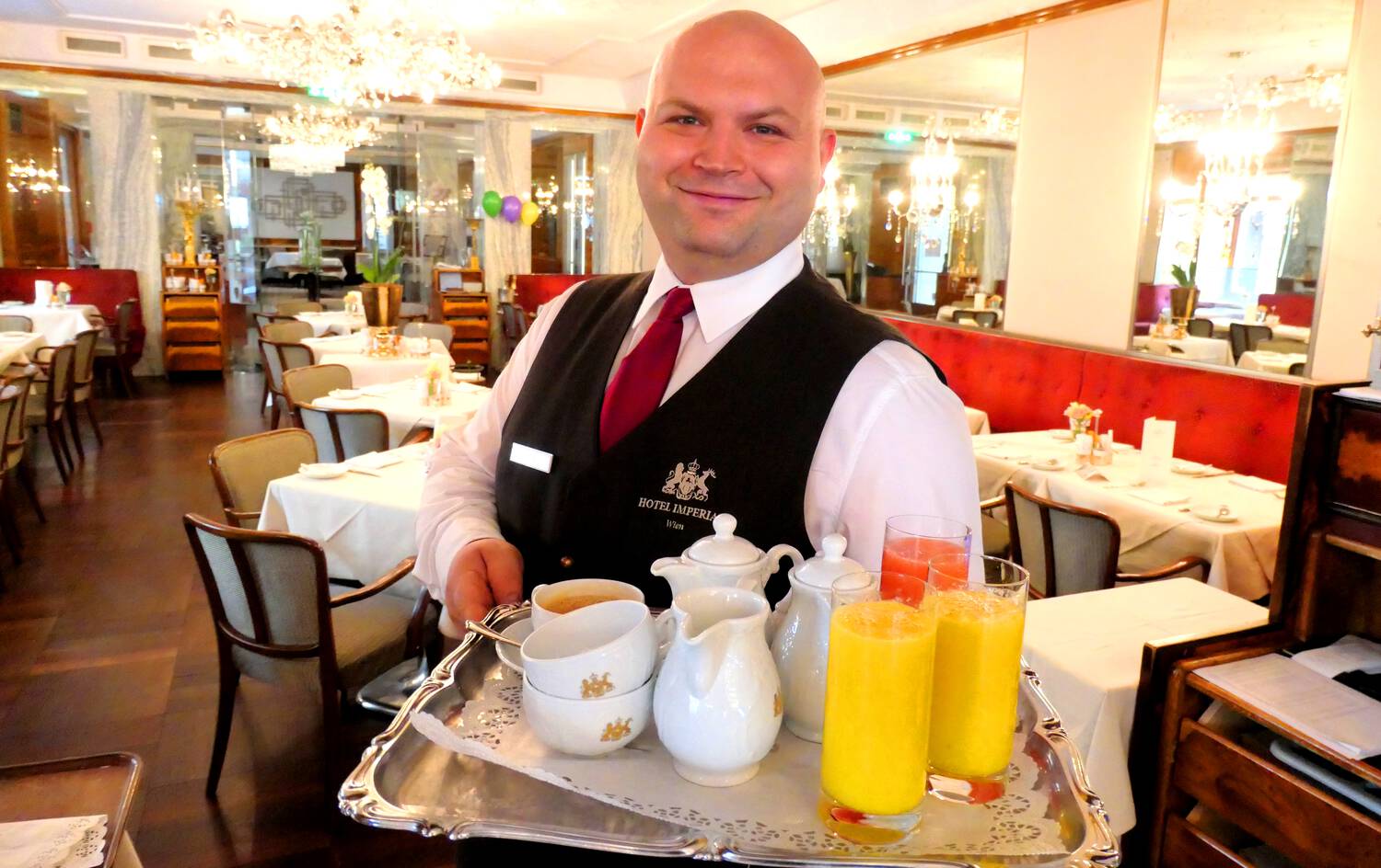 Aber nicht nur in der Imperial-Bar kann man sich in den großen, kuscheligen, bequemen Sesseln sehr wohl fühlen - das Genießen beginnt schon am frühen Morgen: 20 Mitarbeiterinnen und Mitarbeiter, perfekte Kellner und Patissiers verwöhnen die Gäste im oder vor dem "Imperial" (auf der Terrasse) mit opulenten Frühstücksspezialitäten. Besonders hervorzuheben ist nicht nur der fein aufgeschnittene zarte Schinken, sondern auch die für das "Imperial" berühmten süßen Wiener Gebäck-Leckereien - kleine, süße und wunderbare Extras - für alle Blätterteig- oder Hörnchen-Liebhaber, für Plunderteig- und Knusper-Fans. Unser Foto (nächste Seite unten) zeigt einen "charmanten kulinarischen Morgen-Wecker" - mit feinsten Überraschungen auf dem Tablett - ein toller "Imperial"-Frühstücks-Start - Genuss pur schon am frühen Morgen - oder auch bei einem "Frühstücks-Gläschen" Champagner (bis 11 Uhr!).