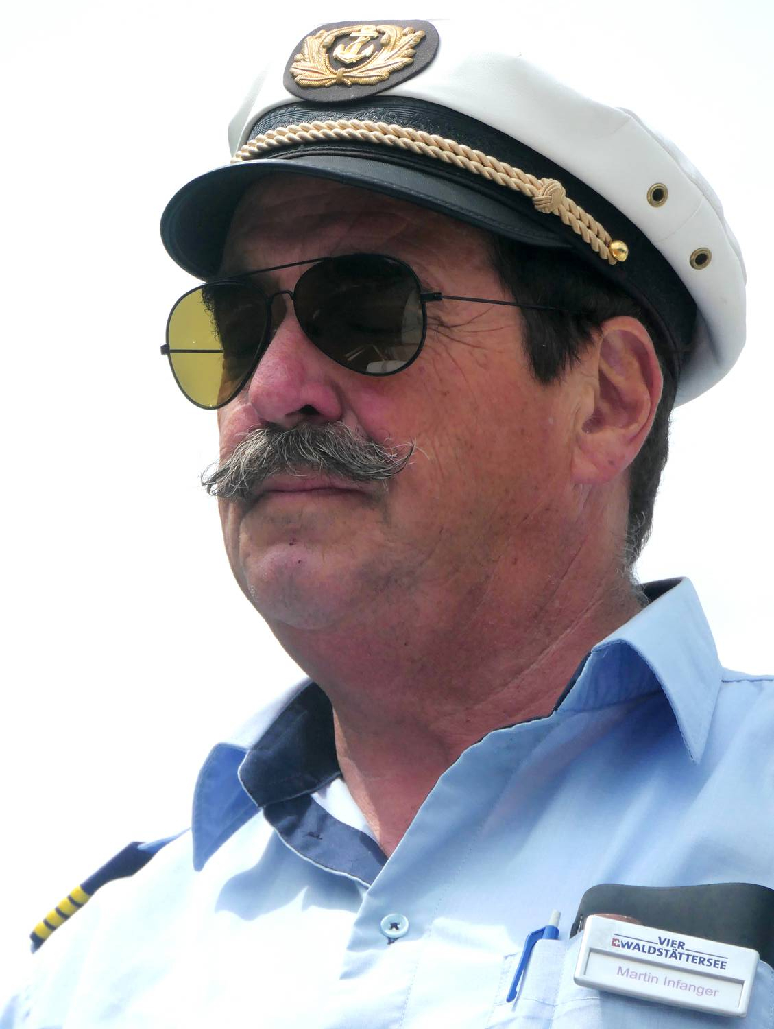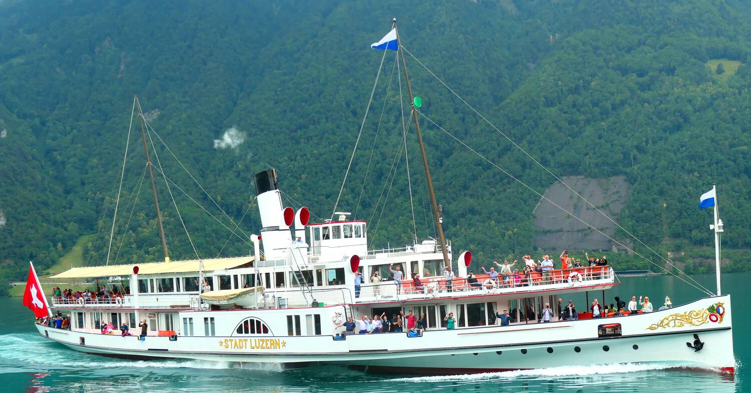 Vom nostalgischen Dampfschiff mit Jugendstil-Salon bis zur topmodernen Yacht mit Cabrio-Dach: Die Flotte der Schifffahrtsgesellschaft des Vierwaldstättersees (SGV) AG mit ihren 5 Raddampfern und den 14 Motorschiffen präsentiert für alle Passagiere pure Romantik. Im Jahr 2017 war die Aufmerksamkeit auf das neue Schiff „Diamant“ gerichtet. Das neue grosse Motorschiff setzt mit seinen fünf Decks und bezüglich Qualität und Innovation einen Meilenstein in der Schweizer Schifffahrt. Die Gäste können sich an zahlreichen Überraschungen erfreuen. Nach zweijähriger Revision ist das Dampfschiff Stadt Luzern (unser Foto) seit Mai 2021 wieder im Einsatz und erstrahlt in neuem Glanz. Und auf der Raddampfer-Brücke: ein Kapitän wie "aus dem Bilderbuch!" By the way: Der Vierwaldstättersee ist rund 30 Kilometer lang und bis zu 263 Meter tief.